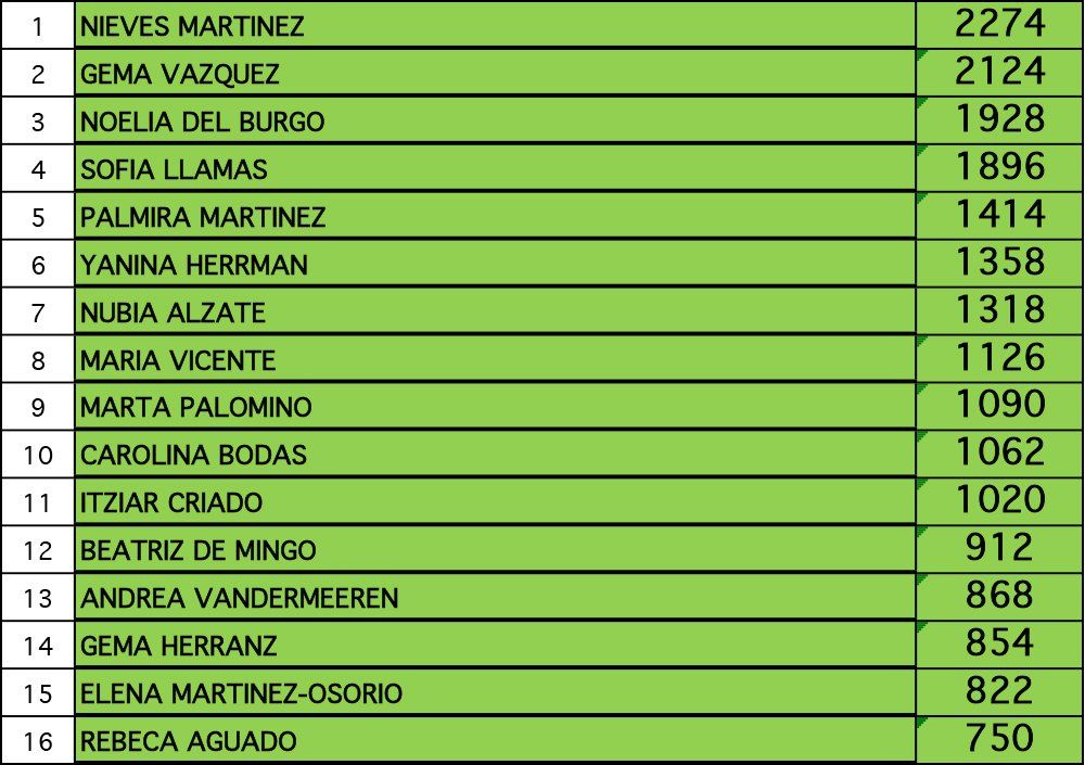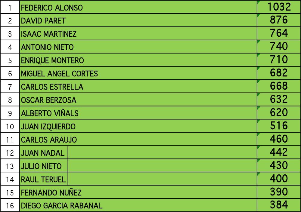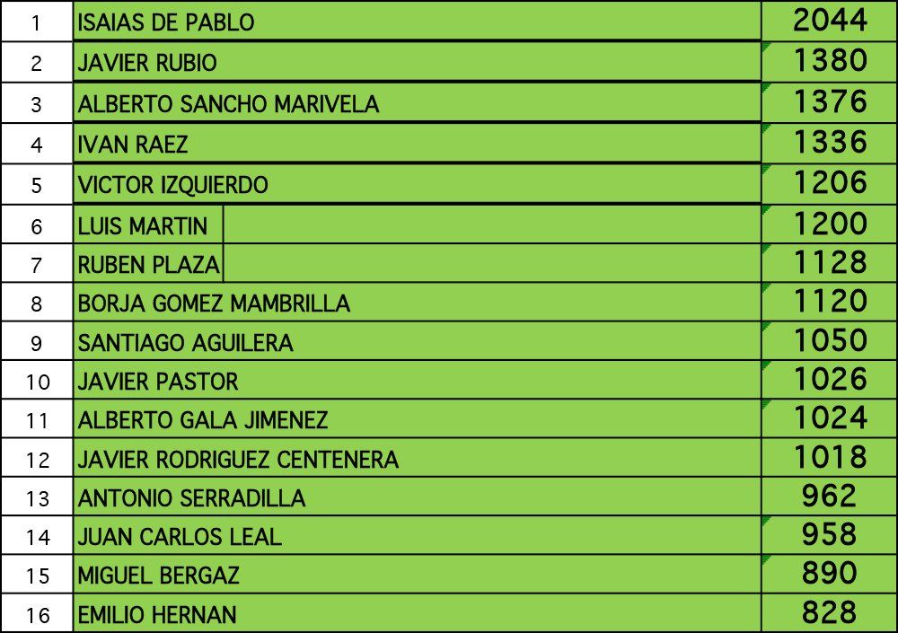 Se muestran las 16 primeras posiciones de cada categoría. Si quieres consultarlo entero, descárgate el fichero Excel.